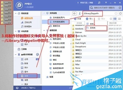 3. 通过 Zepplin 也可将用户自己制作的图标替换运营商文字,前提是要先 DIY 出 PNG 格式图案( 150*40 像素)并放入相关文件夹。以制作好的海贼王图标来示范,打打开 P助手 该文件夹导入文件系统(越狱) --/Library/Zeppelin 中即可。