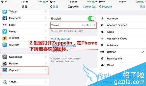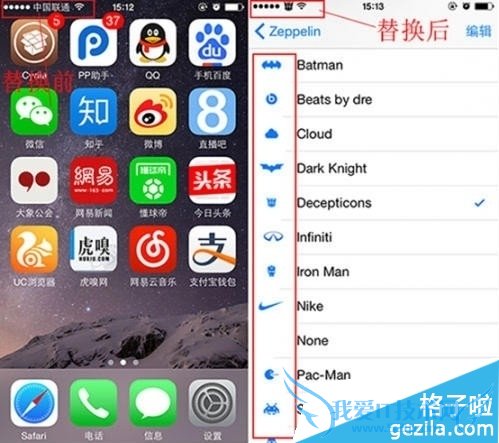 当我们使用 Zeppelin 自带的钢铁侠、蝙蝠侠、苹果等图标或自己制作的图标替换掉中国电信、中国联通或中国移动的运营商文字后, iPhone 分分钟变得有个性了,如下图: