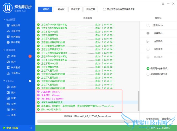 2.下载好固件之后,点击左下角“爱思工具箱”里的“一键刷机”,之后点击右侧“选择固件”,选择刚才下载好的固件;刷机时勾选“保留用户资料刷机”,刷机完成后手机资料不丢失。