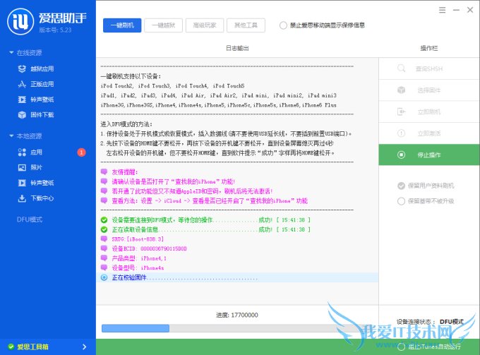 4、需要注意的是iOS 8.2暂时不支持越狱,已越狱用户谨慎升级;若刷机后出现应用闪退,使用爱思助手修复闪退即可。