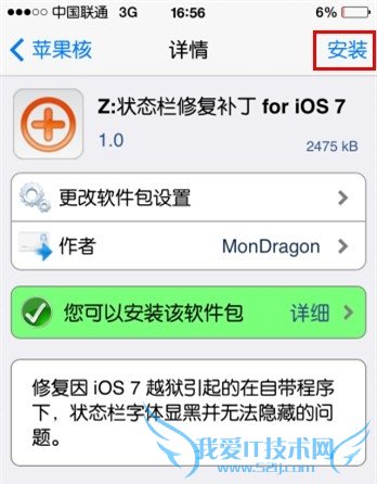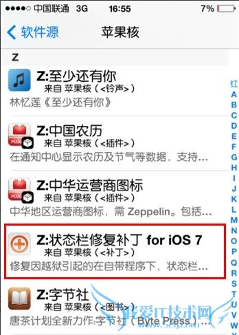 3、进入管理-软件源-点击苹果核-拉到最下面,找到“Z:状态栏修复补丁 for iOS7”