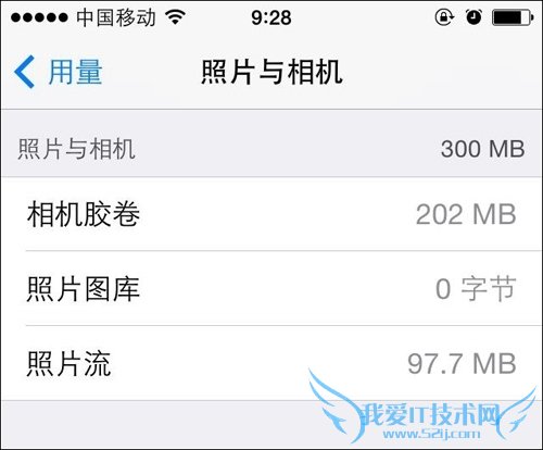 此列表显示了相机胶卷、照片图库和照片流都占用了多少空间,但是,却不能单独删除。删除照片最快的方法是连接到iTunes,导入照片,然后删除。
