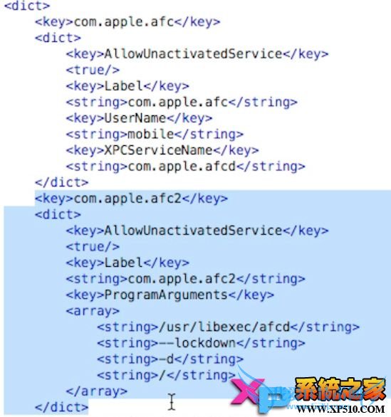 用二进制编辑器打开桌面上的Services.plist文件在“com.apple.afc”段落的下方添加下面的文字: