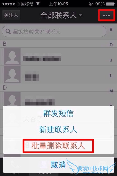 3、点击右上角的【…】选项框,在弹出的列表中选择“批量删除联系人”;