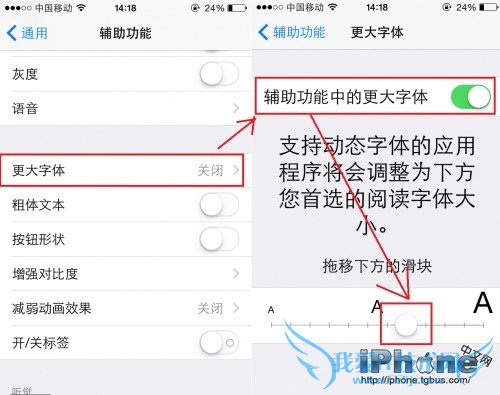 设置——通用——辅助功能——更大字体——辅助功能中的更大字体,滑动按钮开启后,可以拖动下方的滑块来调节字体的大小!