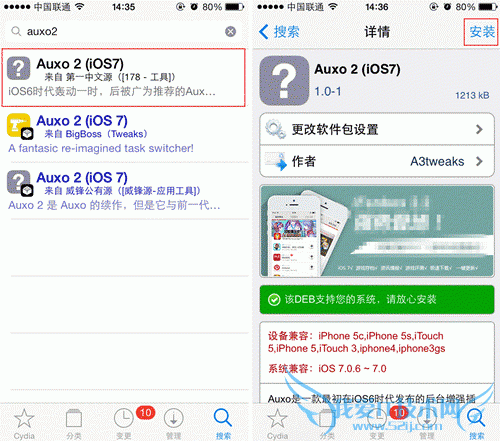 2.新源地址添加成功后,在Cydia底部选“搜索”,然后在搜索框中输入关键字“Auxo2”,选择第一中文源的“Auxo2(iOS7)”并确认安装。(PS:如果搜索不到Auxo2,可以进入Cydia—“变更”—点击左上角“刷新”—再搜索该插件。)