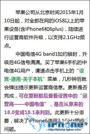 具体来说,iPhone6/6 Plus电信版用户更新后可查看设置中的“运营商-中国电信”,是否从原来的18.0变为18.1来判别,用户可以通过点击“设置-通用-关于本机”更新。