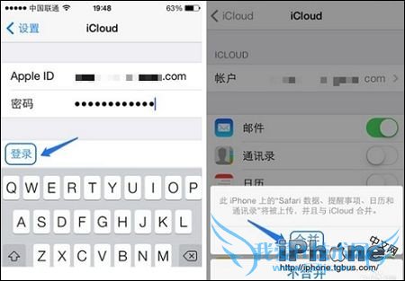 2、进入iCloud设置后,初次登陆会要求我们输入Apple ID账号密码,这个账号密码就说在我们激活iPhone5s的时候创建的,填写上即可登陆即可,登陆后会弹出是否要合并数据,这里我们点击“合并”即可,如下如所示: