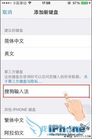 3、在“添加新键盘”页面,点击添加第三方输入法,如搜狗输入法。