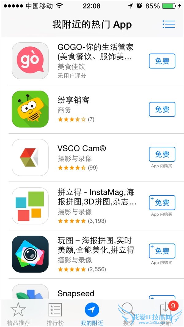 如果你不知道该在自己的苹果设备上安装些什么好玩的应用或游戏,可以试试在苹果应用商店中启用查找附近热门APP功能,来给自己推荐一些好玩的应用。该功能在App Store应用界面下方的工具栏上,点击“我的附近”按钮即可。