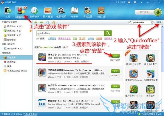 第一步.使用91助手下载安装Quickoffice软件(具体步骤参考本文第一页)