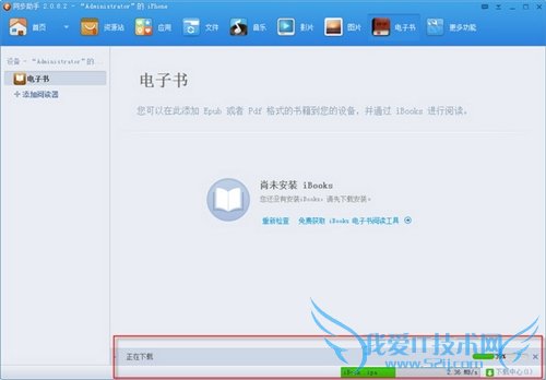 STEP1:启动Windows版同步助手后切换到“电子书”频道页面。如果iPhone 5尚未安装任何电子书阅读器,将会提示先安装。此时可按页面提示点击“免费获取iBooks电子书阅读工具”链接。