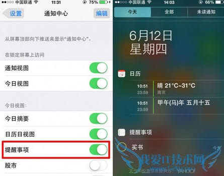 2、选择设置>通知中心,在通知中心中将“提醒事项”的开关打开,之后在任意状态下,下拉菜单就就看到你最近的提醒事项了!
