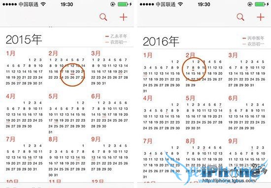 通过这种方式,在年视图界面向下滑动可以方便而快速的查看未来几年究竟哪天是春节,比如2015年是2月19日,而2016年是2月8日,大家可以在下方截图的红色圆圈中查看。