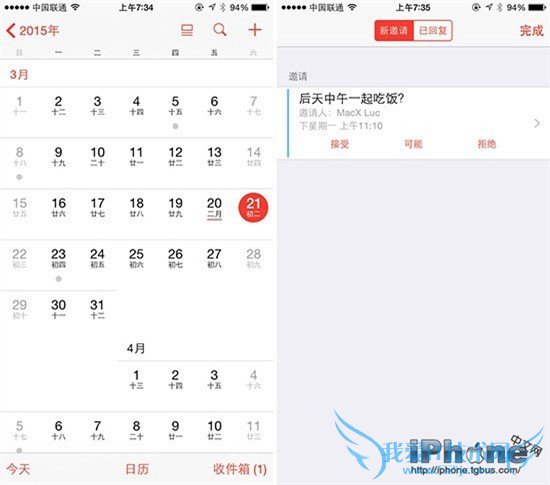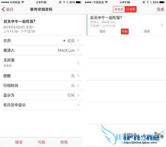 被邀请人很快就会受到通知,提醒有朋友邀请自己参加未来的某个事件。进入iOS8日历后,我们可以看到朋友创建的事件会自动添加至日历中,上图中就是3月23日的小圆点。这时,右下角的“收件箱”内会变成1,提醒用户有人邀请自己参与某个事件。进入后,可以在“新邀请”界面下查看事件详情,包括事件主题,邀请人、时间等。我们可以点击接受、可能或拒绝处理事件,无论选择哪种回答,邀请发起人可以在日历中查看被邀请人的回应。