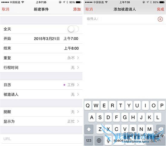 当我们新建日历事件时,只需在iOS8日历的右上角点击+即可。进入新建事件页面,我们可以输入事件名称,设定开始时间,如果需要邀请家人和朋友共同参与时,点击“被邀请人”即可,进入页面后,我们可以直接输入联系人邮件地址,或者点击右侧的+号在通讯录中选择。需要注意的是,只有通讯里的联系人可以邀请。完成添加后。被邀请人的数量会变成1,如果邀请多位联系人,数量也会增加。