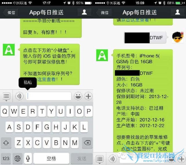 然后在微信上关注App每日推送 的公众号(微信搜“apptoday”或者是“App每日推送”关注 ),把刚复制的序列号粘贴到输入框发送便OK,手机型号、保修信息一目了然!