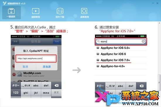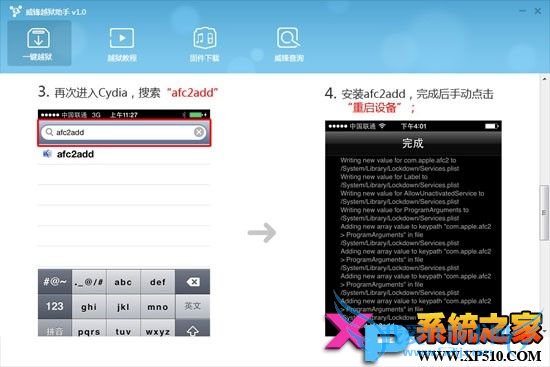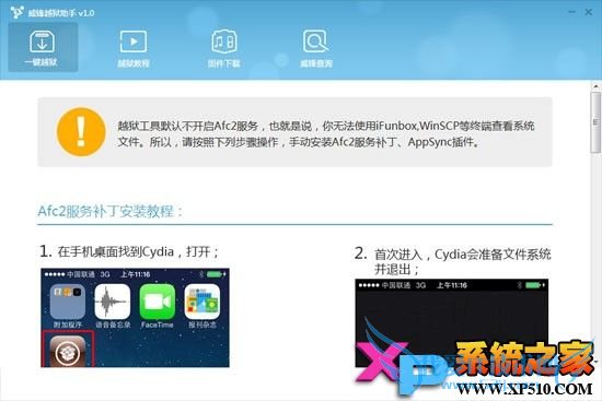 Step 3、出现下列画面时,越狱进入手动操作安装Afc2和AppSync阶段(两个东西是越狱必装的),大家根据威锋越狱助手的提示在设备上操作即可(一共六6个步骤)。