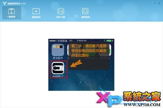 Step 2、当威锋越狱助手出现如下画面时,请打开设备,找到如图越狱图标,点击一下,然后不要做任何操作,继续耐心等待(设备会重启一次),越狱助手会出现两次画面变化,如下图;