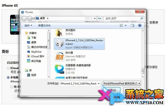 Step 2:将设备连接iTunes,选择你的设备,然后按住键盘的Shift,同时鼠标左键点击“恢复iPhone...”,此时会弹出一个对话框,选择打开刚刚下好的固件,然后就进入了自动刷固件的状态(如下图)