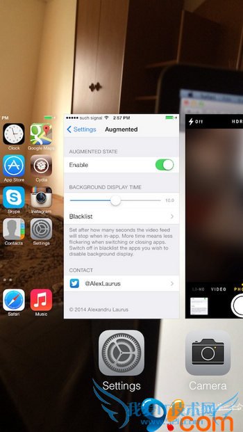 augmented可以为您替换桌面与锁屏背景壁纸为后置摄像头实时拍摄的画面。无需任何激活手势,进入设置后,开启插件开关即可马上完成壁纸替换,实现“透明屏幕”假象。augmented目前并不兼容iPad和iPod touch。