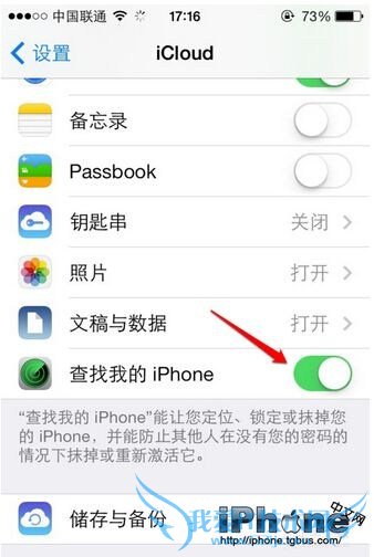 2、下滑,选择“查找我的iPhone”选项,打开此选项。“激活锁定”功能会候自动打开,如果设备丢失或者被盗,“激活锁定”可以防止他人使用或者出售您的设备。