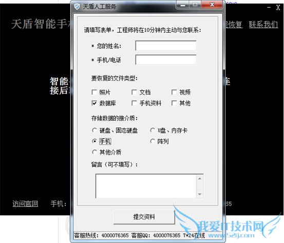 第六步:填写提交人工服务表单,天盾数据恢复中心的工程师会尽快跟用户联系,为用户解决手机数据丢失问题。