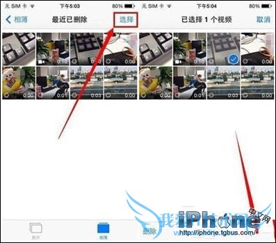 2、然后点击进入该相薄中,点击右上方的选择选项,你便可以选择想要恢复的照片或视频,然后再点一下右下方的恢复功能即可。