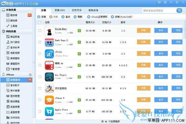 第一步,将iPhone与电脑相连接,打开iTools后,在本地资源栏目中,“程序库”选项页面,可以看到已经iTunes下载好的应用。