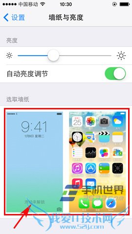2)在“好壁纸”选取壁纸后,返回主界面,点击“设置”进入。在“设置”菜单栏选择“墙纸与亮度”,最后点击“选取墙纸”。(如下图所示)
