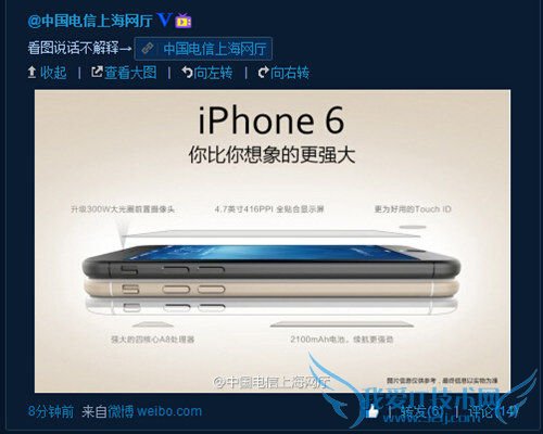 眼瞅着明天凌晨,吸引了全世界人目光的两款大屏的 iPhone 6 就要正式发布了,在这之前我们来看看苹果“中国好队友”——电信微博曝光的 iPhone 6电信版详细配置。