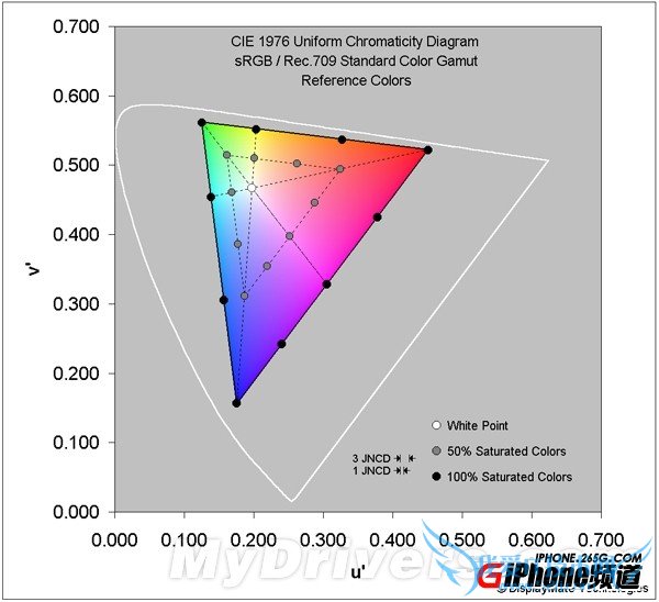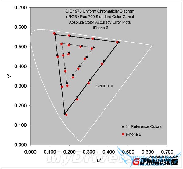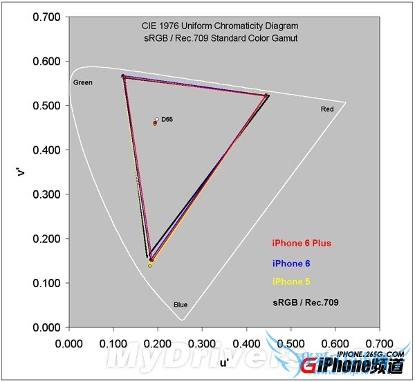 在sRGB这个选项测试中,iPhone 6和6 Plus的色彩还原度相当的准确,同时Displaymate还强调,新iPhone屏幕亮度与前代iPhone保持一致,并且反射效果控制的更好,这得益于苹果在两者的LCD显示屏和表层玻璃之间加入了一层偏振光片(镀膜涂层)的效果。