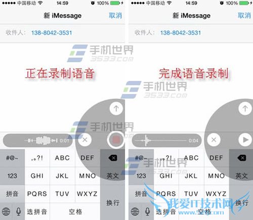1)进放iPhone6plus【短信】界面,添加收件人后,点击【麦克风】。(如下图)