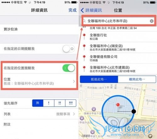 点击「在指定的位置提醒我」,接着在搜寻框中输入要去的地点,设定完成之后再点选下方的「抵达此地」,这样到达超市之后 iPhone 就会自动提醒你要「买色拉油」!