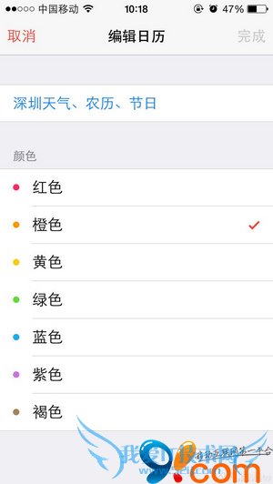 小技巧:在新设置的通知中心显示农历之后,还有一种小技巧的,看上图绿色的横线,这种颜色是可以更换的,按照下图显示,点击“深圳天气、农历、节日”后面的红色感叹号,会出现七种颜色,选择自己喜欢的颜色之后,就会在通知中心显示对应的颜色。