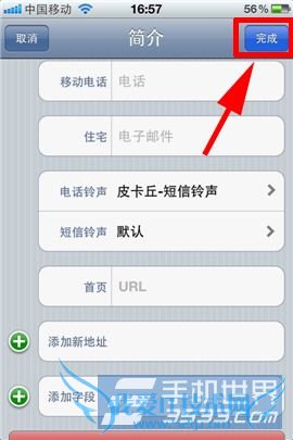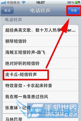 3)选择需要设置的铃声,然后点击右上角“存储”,然后再点选右上角“完成”,这样就把联系人铃声设置好了。