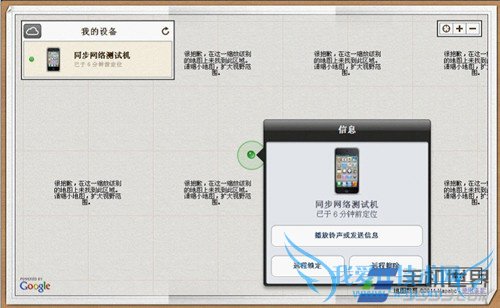 四、iCloud会自动获取您的地理信息,然后显示在Google地图中。这里需要翻墙,否则永远获取不到地理信息!但还能进行发送消息、远程锁定或者远程擦除等操作。点击设备信息右侧的“感叹号”就会显示“播放铃声或发送信息、远程锁定、远程删除”相关操作。