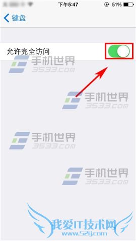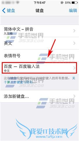 3)选择你下载的输入法,这里以【百度输入法】为例,进入后打开【允许完全访问】右边滑块即可。(如下图)