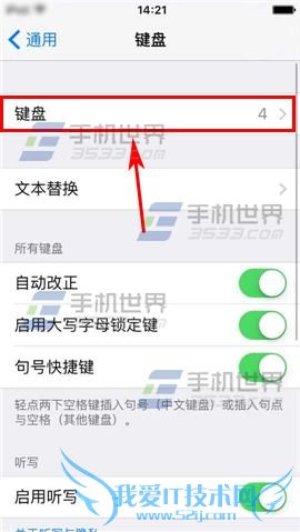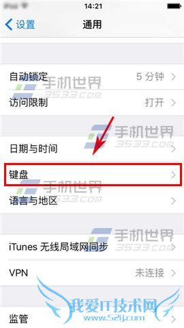2)在通用界面选择【键盘】,接着再点击【键盘】一栏。(如下图)