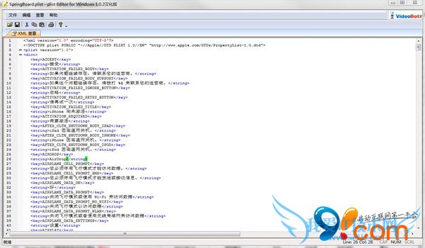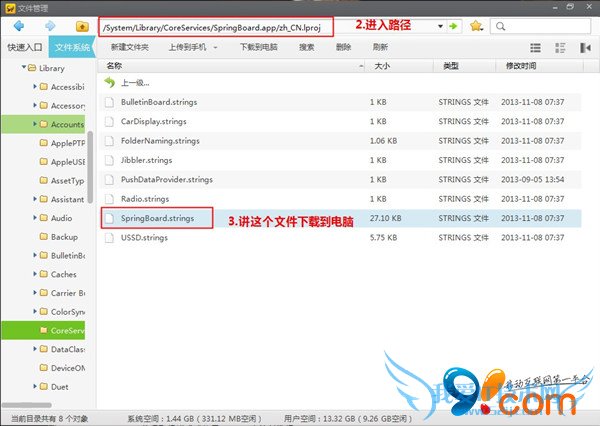 2.打开91手机助手,进入路径/System/Library/CoreServices/SpringBoard.app/zh_CN.lproj,然后找到文件SpringBoard.strings