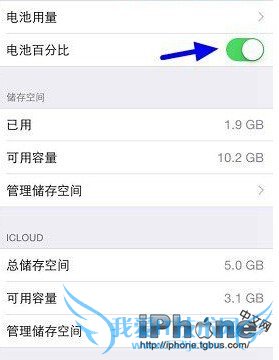 三、进入电量设置之后,我们往下拉就可以找到有“电池百分比”设置选项,将其开关打开,即可实现iPhone6 plus电池百分比显示了;