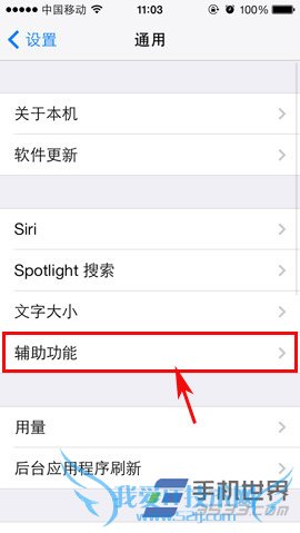 1)首先,点击“设置”进入,接着点击“通用”。进入“通用”界面后点击“辅助功能”按钮。(如下图所示)
