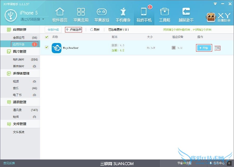 5.如显示有需要的升级的应用,可点击“应用升级”这个分类进行查看,选择要升级的应用,点击“升级”按钮,就可对应用进行升级了。若要一次性升级所有应用,可直接点击“全部升级”按钮。若不想升级,可点击“忽略”按钮,取消升级提示。