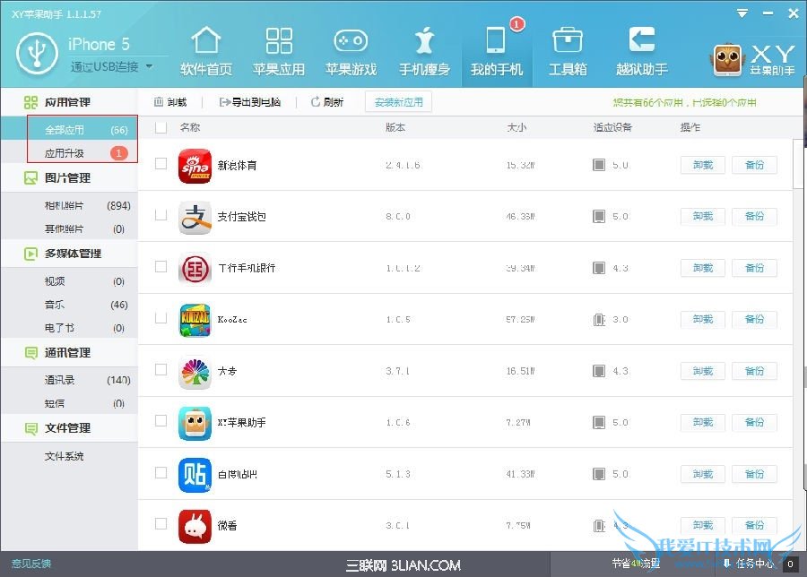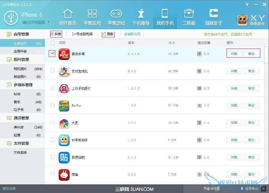3.选中需要管理的程序,如:选中下图中“新浪体育”应用后,可按自己的需要对其进行“卸载”,“备份”的操作。操作完成后可点击“刷新”按钮查看最新的管理结果。