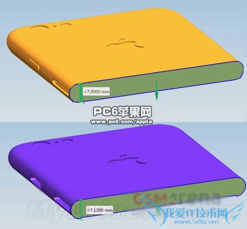 那么关键的,模型图显示的数据是,iPhone 6S的机身厚度为7mm,相比iPhone 6增加了0.1mm,而iPhone 6S Plus 的厚度则为7.13 mm,要比iPhone 6 Plus多出0.03mm。
