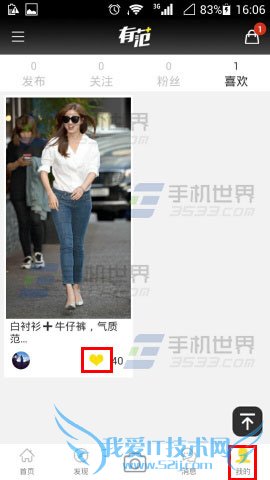 1)首先先打开有范,进去之后点击【我的】,接着在喜欢页面点击【心形】就可以了。(如下图)
