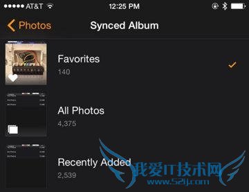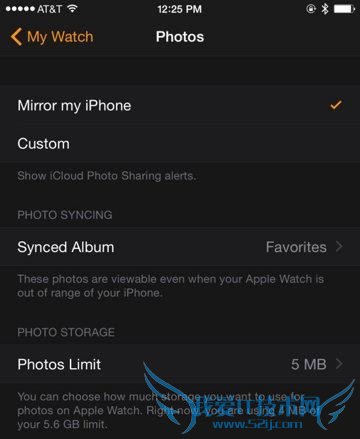 4,点击“同步相册”来选择同步哪一个iPhone相册到Apple Watch上。用户也可以选择“个人收藏”这一相册,以后只要被收藏的照片都会自动同步推送到Apple Watch上。