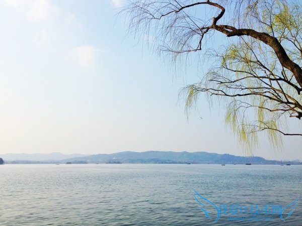 我想表达的是春天的湖光山色,垂柳露新芽的景象。