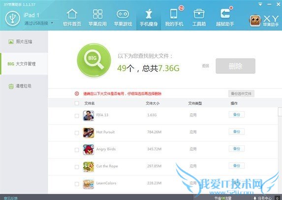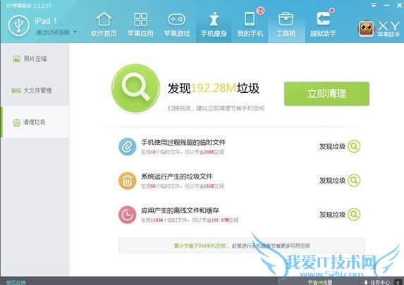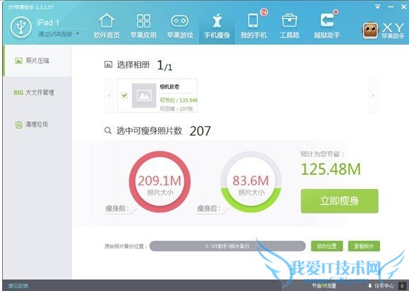 XY苹果助手的一大特色就是系统瘦身功能,有些用户的ios设备只有16G大小,安装几个大型软件/游戏或者使用了一段时间后空间就所剩无几了,XY苹果助手的系统瘦身功能可以帮助用户清理手机垃圾,找出没用少用的大文件,并能无损处理手机照片,轻松为用户的设备腾出大量空间。