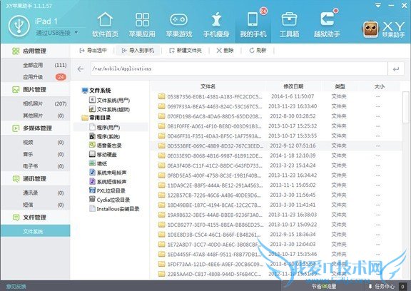 XY苹果助手对于ios设备的管理同样在行,不仅支持应用管理(安装/卸载/升级)功能,并且提供了照片、视频、音乐等导出导入;通迅录、短信备份恢复等功能,还有文件系统管理,方便用户管理文件。